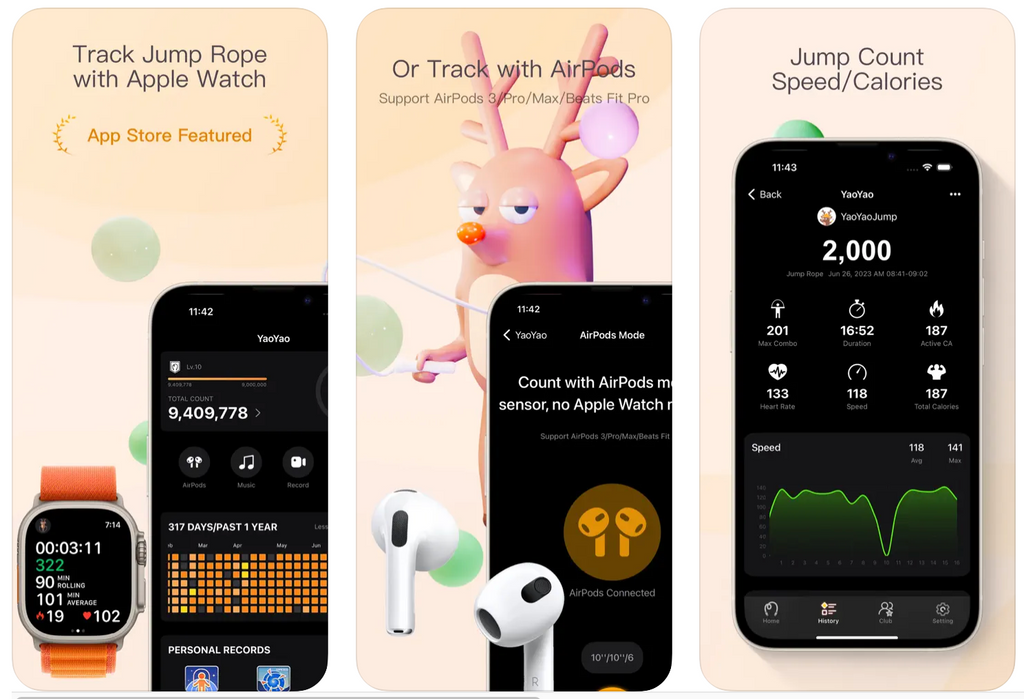 Quick Summary: YaoYao is an intuitive app that tracks jump rope exercises using your device's motion sensors, offering detailed statistics on jumps, calories burned, and workout time. It also includes fun game-like elements to keep you motivated.