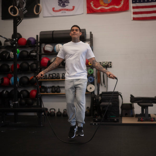 Albert jumping with the black Muay Thai 3.0 weighted jump rope.