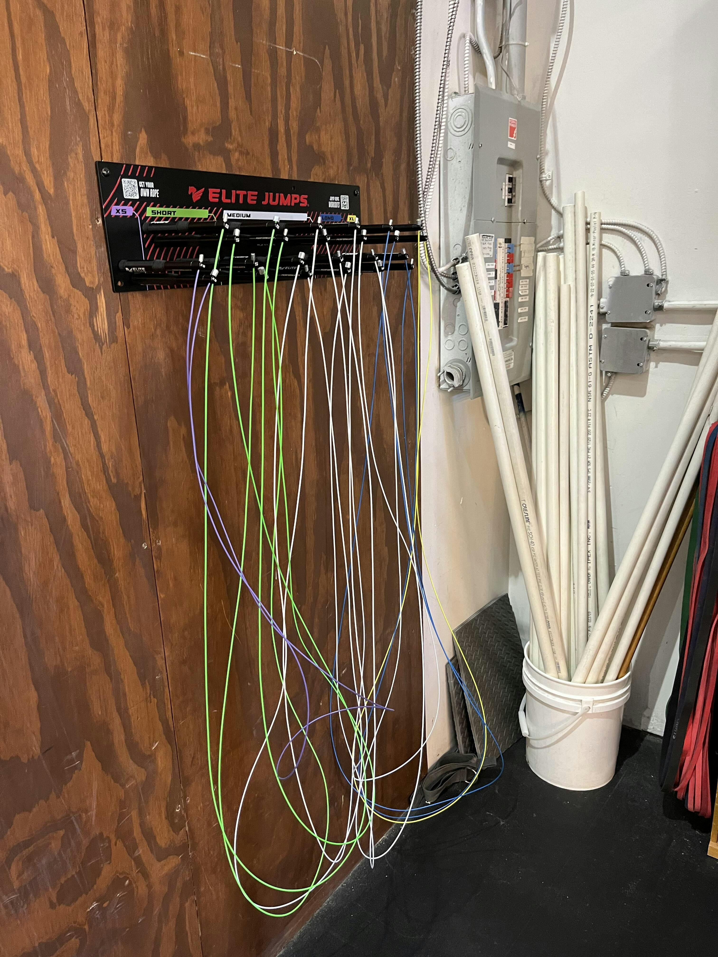 This has everything a gym needs. The pegs for holding the ropes make it easy to grab and return them during sessions. Plus, the cables won't tangle, and the color scheme makes identifying the right size incredibly simple.