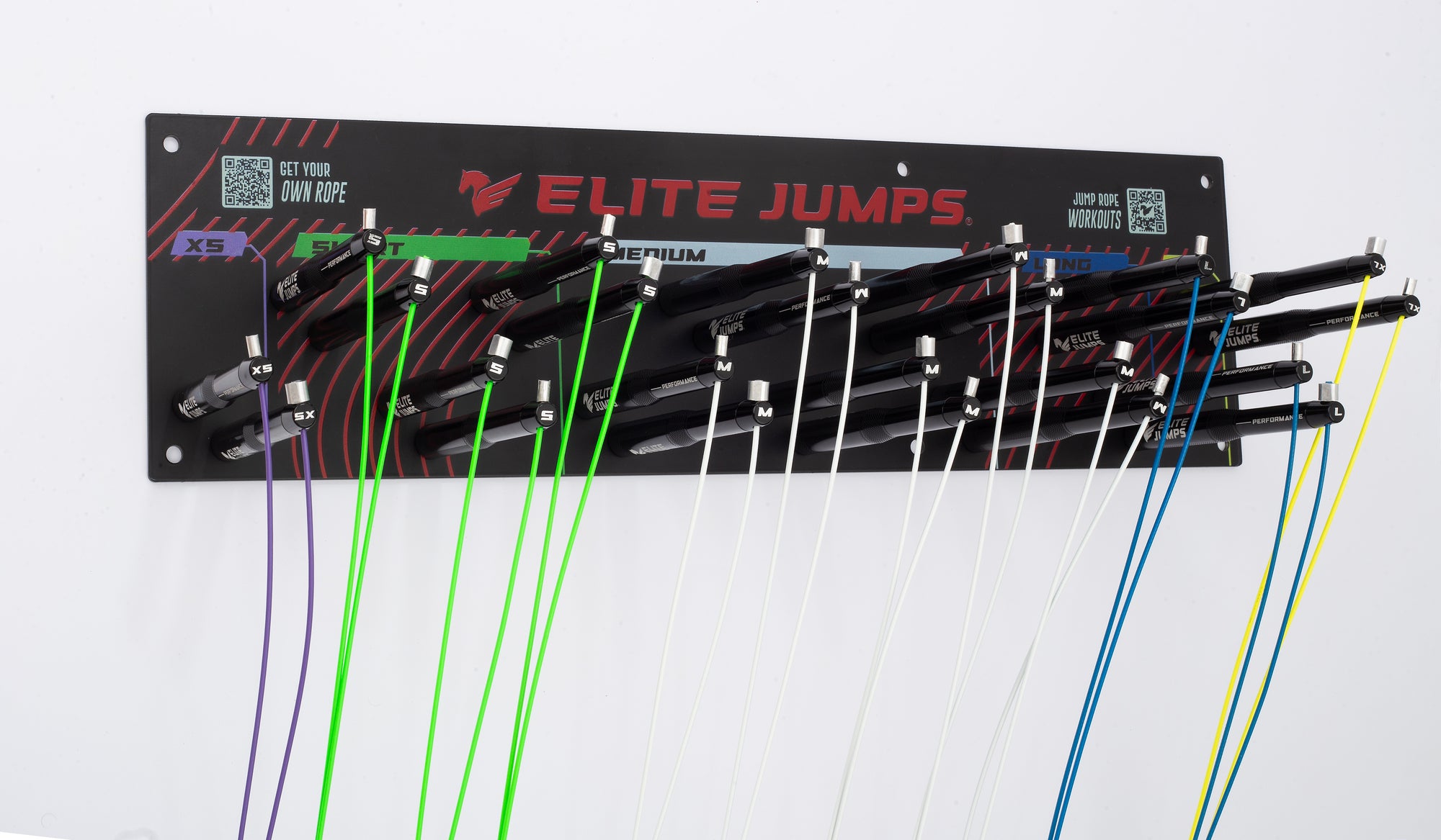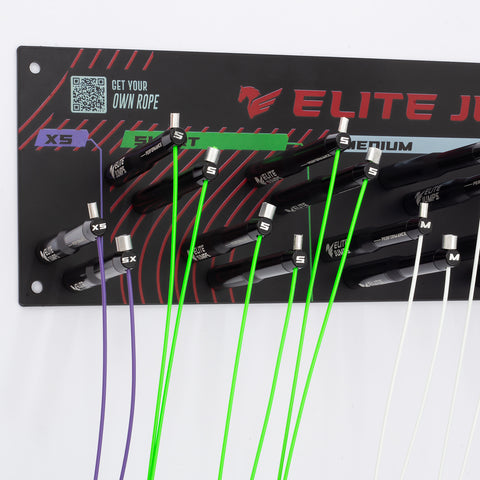 A premium jump rope rack set for gyms and sports clubs. Includes 12 Sports Performance Speed Jump Ropes in either 3 or 5 custom lengths.